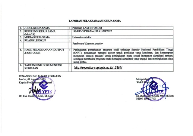 Biro, Kerjasama (2025) Kerjasama Dengan Universitas Adzkia Dalam Peningkatan Kualitas Dosen Prodi Sistem Informasi Dibidang Akademik dan Pelatihan Laminfokom. Biro Kerjasama UPI YPTK. (Unpublished)