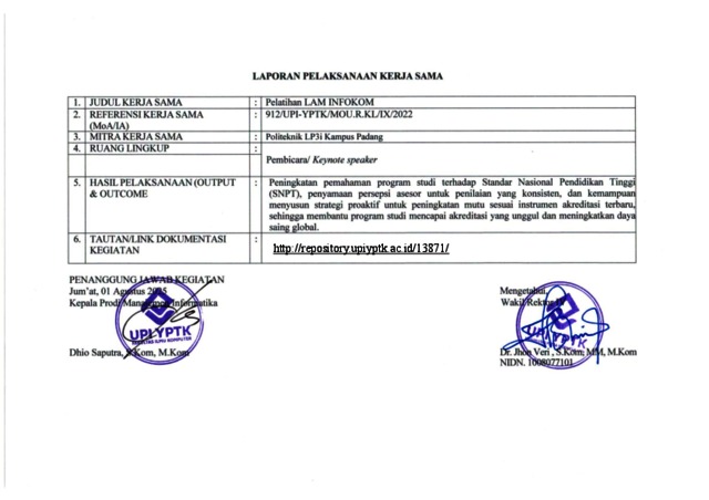 Biro, Kerjasama (2025) Kerjasama Dengan Politeknik LP3I Dalam Peningkatan Kualitas Dosen Prodi Manajemen Informatika Dibidang Akademik Dan Pelatihan Laminfokom. Biro Kerjasama UPI YPTK. (Unpublished)