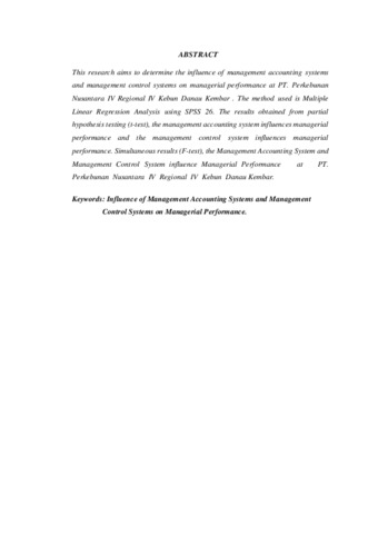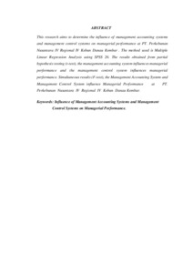 Penelitian ini bertujuan untuk mengetahui pengaruh sistem akuntansi manajemen dan sistem pengendalian manajemen terhadap kinerja manajerial pada PT. Perkebunan Nusantara IV Regional IV Kebun Danau Kembar. Metode yang digunakan adalah Analisis Regresi Linear Berganda dengan menggunakan SPSS 26. Hasil yang didapatkan dari uji hipotesi secara parsial (uji-t), Sistem Akuntansi manajemen berpengaruh terhadap kinerja manajerial dan sistem pengendalian manajemen berpengaruh terhadap kinerja manajerial. Hasil secara simultan (uji�F), Sistem Akuntansi Mananajemen dan Sistem Pengendalian Manajemen berpengaruh terhadap Kinerja Manajerial Pada PT. Perkebunan Nusantara IV Regional IV Kebun Danau Kembar.