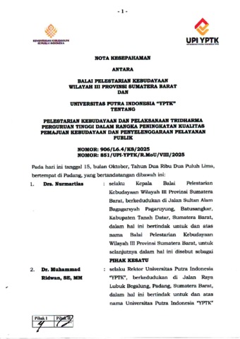 Biro, Kerjasama (2025) NOTA KESEPAHAMAN ANTARA BALAI PELESTARIAN KEBUDAYAAN WILAYAH III PROVINSI SUMATERA BARAT DENGAN UNIVERSITAS PUTRA INDONESIA. Biro Kerjasama UPI YPTK. (Unpublished)