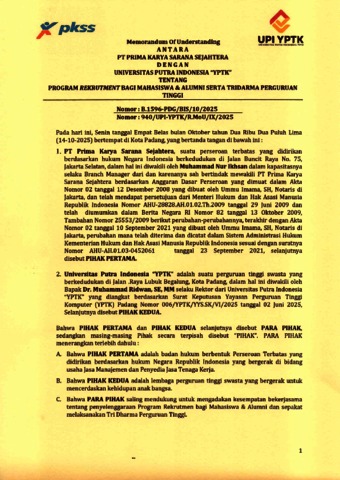 Biro, Kerjasama (2025) MEMORANDUM OF UNDERSTANDING ANTARA PT PRIMA KARYA SARANA SEJAHTERA DENGAN UNIVERSITAS PUTRA INDONESIA “YPTK” TENTANG PROGRAM REKRUTMENT BAGI MAHASISWA & ALUMNI SERTA TRIDARMA PERGURUAN TINGGI. Biro Kerjasama UPI YPTK. (Unpublished)