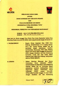 Perjanjian Kerja Sama antara Dinas Koperasi dan UKM Kota Padang dan Fakultas Ekonomi dan Bisnis Universitas Putra Indonesia “YPTK” bertujuan untuk mendukung program pembangunan daerah serta penguatan kapasitas akademik melalui kegiatan pendidikan, penelitian, dan pengabdian masyarakat. Kegiatan tersebut mencakup program magang mahasiswa, praktisi mengajar, penelitian kolaboratif antara dosen dan mahasiswa, serta pengabdian kepada masyarakat yang difokuskan pada optimalisasi laporan keuangan dan manajerial koperasi dan UMKM, serta pelatihan untuk peningkatan kapasitas masyarakat. Kerja sama ini juga menekankan pentingnya kolaborasi berkelanjutan dalam memanfaatkan potensi akademik dan sumber daya daerah demi mendukung pengembangan UMKM di Kota Padang.