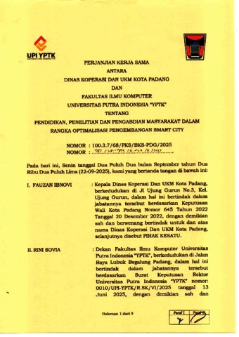 Biro, Kerjasama (2025) PERJANJIAN KERJA SAMA ANTARA DINAS KOPERASI DAN UKM KОТА РАDANG DAN FAKULTAS ILMU KOMPUTER UNIVERSITAS PUTRA INDONESIA “YPТК. Biro Kerjasama UPI YPTK. (Unpublished)