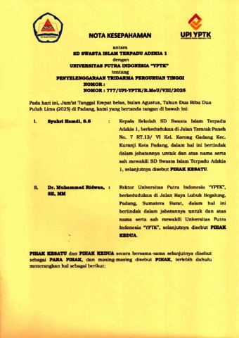 Biro, Kerjasama (2025) NOTA KESEPAHAMAN ANTARA SD SWASTA ISLAM TERPADU ADZKIA 1 DENGAN UNIVERSITAS PUTRA INDONESIA “YPТК" TENTANG PENYELENGGARAAN TRIDARMA PERGURUAN TINGGI. Biro Kerjasama UPI YPTK. (Unpublished)