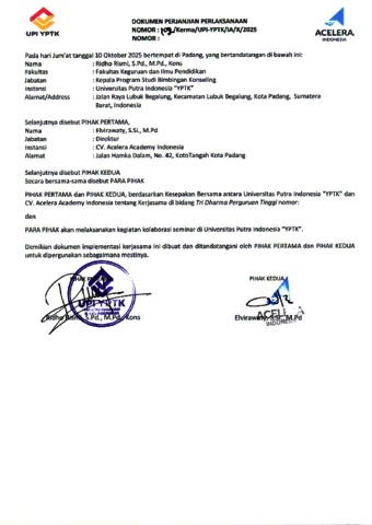 Biro, Kerjasama (2025) Kerjasama Antara Fakultas Keguruan dan Ilmu Pendidikan Prodi Bimbingan Konseling l UPI-YPTK dengan Acelera Academy Indonesia. Biro Kerjasama UPI YPTK. (Unpublished)