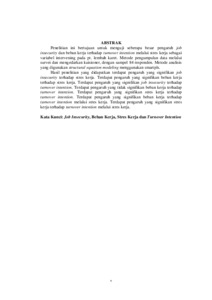 Penelitian ini bertujuan untuk menguji seberapa besar pengaruh job insecurity dan beban kerja terhadap turnover intention melalui stres kerja sebagai variabel intervening pada pt. lembah karet. Metode pengumpulan data melalui survei dan mengedarkan kuisioner, dengan sampel 84 responden. Metode analisis yang digunakan structural equation modeling menggunakan smartpls. Hasil penelitian yang didapatkan terdapat pengaruh yang signifikan job insecurity terhadap stres kerja. Terdapat pengaruh yang signifikan beban kerja terhadap stres kerja. Terdapat pengaruh yang signifikan job insecurity terhadap turnover intention. Terdapat pengaruh yang tidak signifikan beban kerja terhadap turnover intention. Terdapat pengaruh yang signifikan stres kerja terhadap turnover intention. Terdapat pengaruh yang signifikan beban kerja terhadap turnover intention melalui stres kerja. Terdapat pengaruh yang signifikan stres kerja terhadap turnover intention melalui stres kerja. Kata Kunci: Job Insecurity, Beban Kerja, Stres Kerja dan Turnover Intention