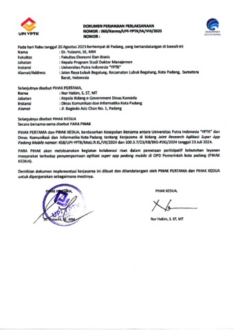 Biro, Kerjasama (2025) Implementation Arrangement (IA) Antara Program Studi Doktor Manajemen Universitas Putra Indonesia "YPTK" dan Dinas Komunikasi dan Informatika Kota Padang tentang Kerjasama di bidang Joint Research Aplikasi Super App Padang Mobile. Biro Kerjasama UPI YPTK. (Unpublished)