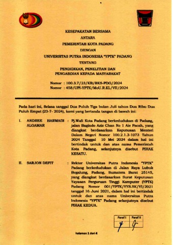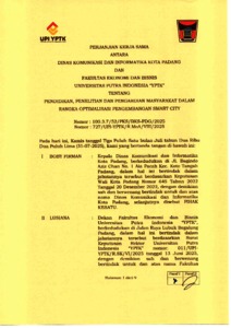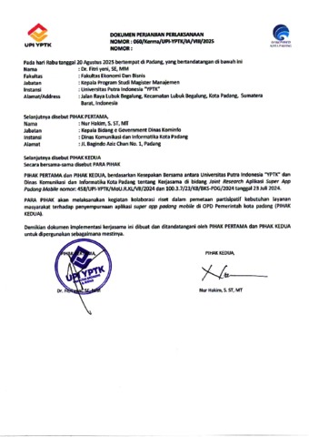 Biro, Kerjasama (2025) Implementation Arrangement (IA) Antara Program Studi Magister Manajemen Universitas Putra Indonesia "YPTK" dan Dinas Komunikasi dan Informatika Kota Padang tentang Kerjasama di bidang Joint Research Aplikasi Super App Padang Mobile. Biro Kerjasama UPI YPTK. (Unpublished)