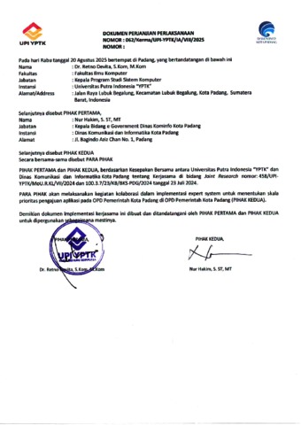 Biro, Kerjasama (2025) Implementation Arrangement (IA) Antara Program Studi Sistem Komputer Universitas Putra Indonesia "YPTK" dan Dinas Komunikasi dan Informatika Kota Padang tentang Kerjasama di bidang Joint Research Aplikasi Super App Padang Mobile. Biro Kerjasama UPI YPTK. (Unpublished)