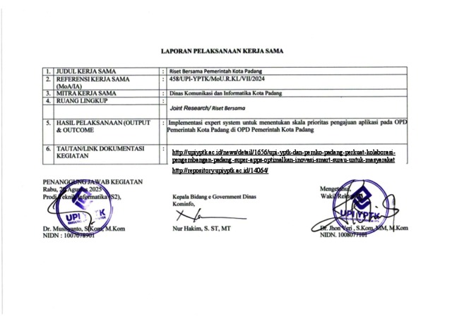 Biro, Kerjasama (2025) Implementation Arrangement (IA) Antara Program Studi Maister Teknik Informatika Universitas Putra Indonesia "YPTK" dan Dinas Komunikasi dan Informatika Kota Padang tentang Kerjasama di bidang Joint Research Aplikasi Super App Padang Mobile. Biro Kerjasama UPI YPTK. (Unpublished)