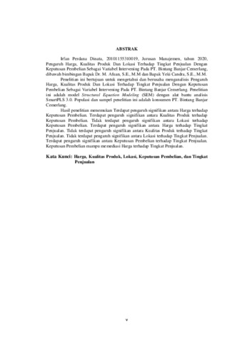 Irfan Perdana Dinata, 20101155310019, Jurusan Manajemen, tahun 2020, Pengaruh Harga, Kualitas Produk Dan Lokasi Terhadap Tingkat Penjualan Dengan Keputusan Pembelian Sebagai Variabel Intervening Pada PT. Bintang Banjar Cemerlang, dibawah bimbingan Bapak Dr. M. Afuan, S.E., M.M dan Bapak Yeki Candra, S.E., M.M. Penelitian ini bertujuan untuk mengetahui dan berusaha menganalisis Pengaruh Harga, Kualitas Produk Dan Lokasi Terhadap Tingkat Penjualan Dengan Keputusan Pembelian Sebagai Variabel Intervening Pada PT. Bintang Banjar Cemerlang. Penelitian ini adalah model Structural Equation Modeling (SEM) dengan alat bantu analisis SmartPLS 3.0. Populasi dan sampel penelitian ini adalah konsumen PT. Bintang Banjar Cemerlang. Hasil penelitian menemukan Terdapat pengaruh signifikan antara Harga terhadap Keputusan Pembelian. Terdapat pengaruh signifikan antara Kualitas Produk terhadap Keputusan Pembelian. Tidak terdapat pengaruh signifikan antara Lokasi terhadap Keputusan Pembelian. Terdapat pengaruh signifikan antara Harga terhadap Tingkat Penjualan. Tidak terdapat pengaruh signifikan antara Kualitas Produk terhadap Tingkat Penjualan. Tidak terdapat pengaruh signifikan antara Lokasi terhadap Tingkat Penjualan. Terdapat pengaruh signifikan antara Keputusan Pembelian terhadap Tingkat Penjualan. Keputusan Pembelian mampu memediasi Harga terhadap Tingkat Penjualan. Kata Kunci: Harga, Kualitas Produk, Lokasi, Keputusan Pembelian, dan Tingkat Penjualan