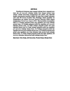 Penelitian ini bertujuan untuk menguji seberapa besar pengaruh stres kerja dan job insecurity terhadap kinerja Guru dengan prestasi kerja sebagai variabel intervening menggunakan data primer yang diperoleh dengan menyebarkan kuesioner kepada 40 orang Guru sebagai responden yaitu pada SD Swasta Excellent Kota Buittinggi. Dalam penelitian ini menggunakan alat analisis Structrual Equation Modeling (SEM) dengan menggunakan Partial Least Square (PLS). Hasil penelitian menunjukkan bahwa (1) Terdapat pengaruh positif yang signifikan stres kerja terhadap prestasi kerja, (2) Terdapat pengaruh positif dan signifikan job insecurity terhadap prestasi kerja, (3) Tidak terdapat pengaruh positif stres kerja terhadap kinerja Guru (4) Tidak terdapat pengaruh positif dan signifikan job insecurity terhadap kinerja Guru, (5) Terdapat pengaruh positif dan signifikan prestasi kerja terhadap kinerja Guru, (6) Terdapat pengaruh kerja positif yang signifikan stres kerja dimediasi oleh prestasi kerja terhadap kinerja Guru, (7) Tidak terdapat pengaruh positif dan tidak signifikan Job insecurity dimediasi oleh prestasi kerja terhadap kinerja Guru. Kata kunci: Stres Kerja, Job Insecurity, Prestasi Kerja, Kinerja Guru