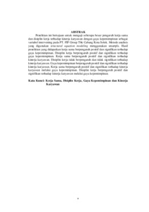 Penelitian ini bertujuan untuk menguji seberapa besar pengaruh kerja sama dan disiplin kerja terhadap kinerja karyawan dengan gaya kepemimpinan sebagai variabel intervening pada PT. FIF Group Tbk Cabang Kota Solok. Metode analisis yang digunakan structural equation modeling menggunakan smartpls. Hasil penelitian yang didapatkan kerja sama berpengaruh positif dan signifikan terhadap gaya kepemimpinan. Disiplin kerja berpengaruh positif dan signifikan terhadap gaya kepemimpinan. Kerja sama berpengaruh positif dan signifikan terhadap kinerja karyawan. Disiplin kerja tidak berpengaruh dan tidak signifikan terhadap kinerja karyawan. Gaya kepemimpinan berpengaruh positif dan signifikan terhadap kinerja karyawan. Kerja sama berpengaruh positif dan signifikan terhadap kinerja karyawan melalui gaya kepemimpinan. Disiplin kerja berpengaruh positif dan signifikan terhadap kinerja karyawan melalui gaya kepemimpinan. Kata Kunci: Kerja Sama, Disiplin Kerja, Gaya Kepemimpinan dan Kinerja Karyawan
