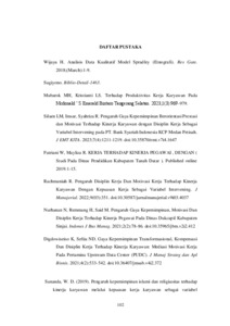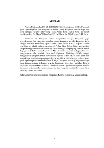 Annisa Fitri Amelia, NO BP 20101155310353, Manajemen (2024), Pengaruh gaya kepemimpinan dan integritas terhadap kinerja karyawan melalui kepuasan kerja sebagai variable intervening pada Polres Lima Puluh Kota. di bawah bimbingan Ibu Dr. Marta Widian Sari, SE., M.M dan Ibu Nila Pratiwi, S.HI, MA. Penelitian ini bertujuan untuk mengetahui adanya Pengaruh gaya kepemimpinan dan integritas terhadap kinerja karyawan melalui kepuasan kerja sebagai variable intervening (pada Polres Lima Puluh Kota). Populasi dalam penelitian ini adalah seluruh pegawai di Polres Lima Puluh Kota, pengambilan sampel menggunakan teknik Sampling Jenuh sehingga sampel yang diambil adalah 41 pegawai di Polres Lima Puluh Kota. Metode analisis induktif pada penelitian ini menggunakan alat analisis Structural Equation Modeling (SEM) dengan menggunakan program Smart partial least square (Smart PLS). Hasil penelitian yang didapat adalah terdapat pengaruh yang signifikan dari beberapa variabel yaitu gaya kepemimpinan terhadap kepuasan kerja, integritas terhadap kepuasan kerja, gaya kepemimpinan terhadap kinerja karyawan, integritas terhadap kinerja karyawan, kepuasan kerja terhadap kinerja karyawan , gaya kepemimpinan melalui kepuasan kerja terhadap kinerja karyawan dan integritas melalui kepuasan kerja terhadap kinerja karyawan. Kata Kunci: Gaya Kepemimpinan, Integritas, Kinerja Karyawan, Kepuasan kerja.