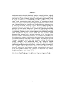 Penelitian ini bertujuan untuk mengetahui pengaruh gaji dan tunjangan terhadap kesejahteraan pegawai melalui kepuasan kerja sebagai variabel intervening (Studi kasus pada SMA Negeri 1 Tanjung Mutiara). Populasi penelitian ini adalah Bapak/ Ibu Kepala Sekolah, Guru dan Staf SMA Negeri 1 Tanjung Mutiara sebanyak 42 orang. Teknik pengumpulan sampel pada penlitian ini menggunakan metode sampel jenuh dengan sampel 42 orang. Teknik pengumpulan data melalui kuesoner yang telah diuji validitas dan reliabilitasnya. Teknik analisis data dalam penelitian ini menggunakan metode Structural Equation Modeling (SEM) SmartPLS 3. Penyebaran kuesioner sebanyak 40 indikator pertanyaan. Dari 40 indikator pertanyaan kuesioner setelah dilakukan uji validitas dan realibilitas menghasilkan 28 indikator dengan nilai Average Variance Extracted (AVE) yaitu Gaji sebanyak 0,710 dan nilai reliabilititas 0,945, Tunjangan sebanyak 0,679 dan nilai reliabilitas 0,937, Kesejahteraan Pegawai sebanyak 0,771 dan nilai reliabilitas 0,959, Kepuasan Kerja sebanyak 0,833 dan nilai reliabilitas 0,972. Hasil penelitian menunjukkan bahwa Gaji berpengaruh positif dan signifikan terhadap Kepuasan Kerja, unjangan berpengaruh positif dan tidak signifikan terhadap Kepuasan Kerja. Gaji berpengaruh positif dan tidak signifikan terhadap Kesejahteraan Pegawai, Tunjangan berpengaruh positif dan tidak signifikan terhadap Kesejahteraan Pegawai. Kepuasan Kerja berpengaruh positif dan signifikan terhadap Kesejahteraan Pegawai. Gaji berpengaruh positif dan signifikan terhadap kesejahteraan pegawai melalui Kepuasan Kerja, Tunjangan berpengaruh positif dan tidak signifikan terhadap Kesejahteraan Pegawai melalui Kepuasan Kerja. Kontribusi variabel Gaji dan Tunjangan terhadap Kepuasan Kerja yaitu sebesar 74,7% serta kontribusi variabel Gaji, Tunjangan dan Kepuasan Kerja terhadap Kesejahteraan Pegawai yaitu sebesar 93,7%. Kata Kunci : Gaji, Tunjangan, Kesejahteraan Pegawai, Kepuasan Kerja