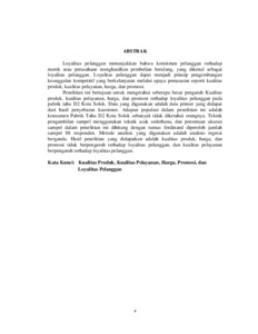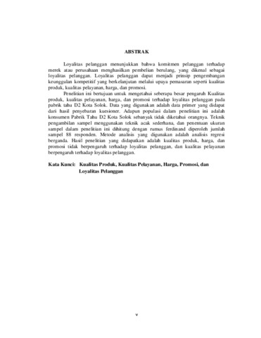 k atau perusahaan menghasilkan pembelian berulang, yang dikenal sebagai loyalitas pelanggan. Loyalitas pelanggan dapat menjadi prinsip pengembangan keunggulan kompetitif yang berkelanjutan melalui upaya pemasaran seperti kualitas produk, kualitas pelayanan, harga, dan promosi. Penelitian ini bertujuan untuk mengetahui seberapa besar pengaruh Kualitas produk, kualitas pelayanan, harga, dan promosi terhadap loyalitas pelanggan pada pabrik tahu D2 Kota Solok. Data yang digunakan adalah data primer yang didapat dari hasil penyebaran kuesioner. Adapun populasi dalam penelitian ini adalah konsumen Pabrik Tahu D2 Kota Solok sebanyak tidak diketahui orangnya. Teknik pengambilan sampel menggunakan teknik acak sederhana, dan penentuan ukuran sampel dalam penelitian ini dihitung dengan rumus ferdinand diperoleh jumlah sampel 88 responden. Metode analisis yang digunakan adalah analisis regresi berganda. Hasil penelitian yang didapatkan adalah kualitas produk, harga, dan promosi tidak berpengaruh terhadap loyalitas pelanggan, dan kualitas pelayanan berpengaruh terhadap loyalitas pelanggan. Kata Kunci: Kualitas Produk, Kualitas Pelayanan, Harga, Promosi, dan Loyalitas Pelanggan