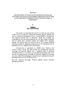 Maksud dari diadakannya penelitian ini yaitu mengetahui dan mengkaji apakah terdapat pengaruh pengetahuan keuangan , sikap keuangan dan Pendapatan terhadap perilaku manajemen keuangan pada pelaku UMKM di Payakumbuh. Metoda analisis yang digunakan adalah deskriptif , uji Validitas, uji Normalitas , uji multikolinearitas dan uji heteroskedastisitas. Teknik analisis data yang digunakan adalah analisis regresi linier sederhana dan analisis regresi linier berganda . Sampel yang diambil didasarkan pada penggunaan teknik prototype stratified sampling dengan cara menyebar kuesioner kepada 80 responden dari 80 populasi yang merupakan Pelaku UMKM di Payakumbuh . Karakteristik responden merupakan Pelaku UMKM. Berdasarkan hasil penelitian memperlihatkan bahwa baik secara parsial maupun simultan pengetahuan keuangan dan sikap keuangan berpengaruh signifikan terhadap perilaku manajemen keuangan. Untuk dapat meningkatkan pengetahuan keuangan dapat dilakukan dengan meningkatkan pengetahuan keuangan dan sikap keuangan dengan cara peningkatan kesadaran, keterampilan dan ikut serta dalam berbagai seminar mengenai pembelajaran dan perencanaan produk, layanan serta resiko keuangan. Kata Kunci: Pengetahuan Keuangan, Sikap Keuangan, Pendapatan , Perilaku Manajamen Keuangan