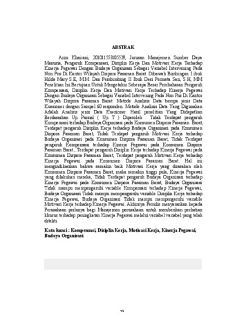 Arzu Khairani, 201011553105529, Jurusan Manajemen Sumber Daya Manusia, Pengaruh Kompensasi, Disiplin Kerja Dan Motivasi Kerja Terhadap Kinerja Pegawai Dengan Budaya Organisasi Sebagai Variabel Intervening Pada Non Pns Di Kantor Wilayah Dispora Pasaman Barat. Dibawah Bimbingan I ibuk Hilda Mary S.E, M.M. Dan Pembimbing II Ibuk Desi Permata Sari, S.H, MM Penelitian Ini Bertujuan Untuk Mengetahui Seberapa Besar Pembahasan Pengaruh Kompensasi, Disiplin Kerja Dan Motivasi Kerja Terhadap Kinerja Pegawai Dengan Budaya Organisasi Sebagai Variabel Intervening Pada Non Pns Di Kantor Wilayah Dispora Pasaman Barat. Metode Analisis Data berupa jenis Data Kuesioner dengan Sampel 60 responden. Metode Analisis Data Yang Digunakan Adalah Analisis jenis Data Kuesioner. Hasil penelitian Yang Didapatkan Berdasarkan Uji Parsial ( Uji T ) Diperoleh : Tidak Terdapat pengaruh Kompensasi terhadap Budaya Organisasi pada Konsumen Dispora Pasaman Barat, Terdapat pengaruh Disiplin Kerja terhadap Budaya Organisasi pada Konsumen Dispora Pasaman Barat, Tidak Terdapat pengaruh Motivasi Kerja terhadap Budaya Organisasi pada Konsumen Dispora Pasaman Barat, Tidak Terdapat pengaruh Kompensasi terhadap Kinerja Pegawai pada Konsumen Dispora Pasaman Barat., Terdapat pengaruh Disiplin Kerja terhadap Kinerja Pegawai pada Konsumen Dispora Pasaman Barat, Terdapat pengaruh Motivasi Kerja terhadap Kinerja Pegawai pada Konsumen Dispora Pasaman Barat. Hal ini mengindikasikan bahwa semakin baik Motivasi Kerja yang dirasakan oleh Konsumen Dispora Pasaman Barat, maka semakin tinggi pula, Kinerja Pegawai yang dilakukan mereka, Tidak Terdapat pengaruh Budaya Organisasi terhadap Kinerja Pegawai pada Konsumen Dispora Pasaman Barat, Budaya Organisasi Tidak mampu mempengaruhi variable Kompensasi terhadap Kinerja Pegawai, Budaya Organisasi Tidak mampu mempengaruhi variable Disiplin Kerja terhadap Kinerja Pegawai, Budaya Organisasi Tidak mampu mempengaruhi variable Motivasi Kerja terhadap Kinerja Pegawai. Akhirnya Penulis menyarankan kepada Perusahaan perlunya bagi Manajemen perusahaan untuk memberikan perhatian khusus terhadap peningkatan Kinerja Pegawai melalui variabel variabel yang telah diteliti. Kata kunci : Kompensasi, Disiplin Kerja, Motivasi Kerja, Kinerja Pegawai, Budaya Organisasi
