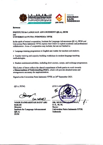 Kerja sama antara Universitas Putra Indonesia “YPTK” Padang dan Institute for Language Advancement (IfLA) bertujuan untuk memperkuat hubungan akademik dan pengembangan pendidikan di bidang bahasa, linguistik, dan inovasi pembelajaran. Kedua pihak sepakat membangun kemitraan berdasarkan prinsip kesetaraan, saling menguntungkan, dan kolaborasi internasional.