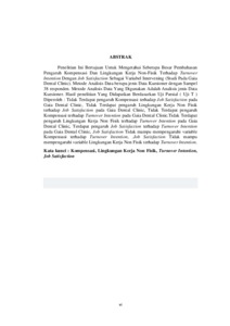 Penelitian Ini Bertujuan Untuk Mengetahui Seberapa Besar Pembahasan Pengaruh Kompensasi Dan Lingkungan Kerja Non-Fisik Terhadap Turnover Intention Dengan Job Satisfaction Sebagai Variabel Intervening (Studi Pada Gaia Dental Clinic). Metode Analisis Data berupa jenis Data Kuesioner dengan Sampel 38 responden. Metode Analisis Data Yang Digunakan Adalah Analisis jenis Data Kuesioner. Hasil penelitian Yang Didapatkan Berdasarkan Uji Parsial ( Uji T ) Diperoleh : Tidak Terdapat pengaruh Kompensasi terhadap Job Satisfaction pada Gaia Dental Clinic, Tidak Terdapat pengaruh Lingkungan Kerja Non Fisik terhadap Job Satisfaction pada Gaia Dental Clinic, Tidak Terdapat pengaruh Kompensasi terhadap Turnover Intention pada Gaia Dental Clinic.Tidak Terdapat pengaruh Lingkungan Kerja Non Fisik terhadap Turnover Intention pada Gaia Dental Clinic, Terdapat pengaruh Job Satisfaction terhadap Turnover Intention pada Gaia Dental Clinic, Job Satisfaction Tidak mampu mempengaruhi variable Kompensasi terhadap Turnover Intention, .Job Satisfaction Tidak mampu mempengaruhi variable Lingkungan Kerja Non Fisik terhadap Turnover Intention. Kata kunci : Kompensasi, Lingkungan Kerja Non Fisik, Turnover Intention, Job Satisfaction