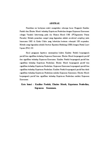 ‘Penelitian ini bertujuan untuk mengetahui seberapa besar Pengaruh Kualitas Produk dan Ekuitas Merek terhadap Keputusan Pembelian dengan Kepuasan Konsumen sebagai Variabel Intervening pada Air Minum Merek SMS (PT.Agramitra Utama Persada). Metode penarikan sampel yang digunakan adalah accidental sampling yaitu konsumen SMS di Kedai Chiko yang kebetulan bertemu sebanyak 100 responden. Metode yang digunakan adalah Stucture Equation Modeling (SEM) dengan Partial Least Square (PLS) 3.0. Hasil pengujian hipotesis menunjukan bahwa Kualitas Produk berpengaruh positif dan signifikan terhadap Kepuasan Konsumen. Ekuitas Merek berpengaruh positif dan signifikan terhadap Kepuasan Konsumen. Kualitas Produk berpengaruh positif dan signifikan terhadap Keputusan Pembelian. Ekuitas Merek berpengaruh positif dan signifikan terhadap Keputusan Pembelian. Kepuasan Konsumen berpengaruh positif dan signifikan terhadap Keputusan Pembelian. Kualitas Produk berpengaruh positif dan tidak signifikan terhadap Keputusan Pembelian melalui Kepuasan Konsumen. Ekuitas Merek berpengaruh positif dan signifikan terhadap Keputusan Pembelian melalui Kepuasan Konsumen. Kata kunci : Kualitas Produk, Ekuitas Merek, Keputusan Pembelian, Kepuasan Konsumen
