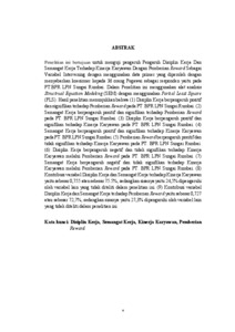 Penelitian ini bertujuan untuk menguji pengaruh Pengaruh Disiplin Kerja Dan Semangat Kerja Terhadap Kinerja Karyawan Dengan Pemberian Reward Sebagai Variabel Intervening dengan menggunakan data primer yang diperoleh dengan menyebarkan koesioner kepada 36 orang Pegawai sebagai responden yaitu pada PT.BPR LPN Sungai Rumbai. Dalam Penelitian ini menggunakan alat analisis Structrual Equation Modeling (SEM) dengan menggunakan Partial Least Square (PLS). Hasil penelitian menunjukkan bahwa (1) Disiplin Kerja berpengaruh positif dan signifikan terhadap Pemberian Reward pada PT. BPR LPN Sungai Rumbai. (2) Semangat Kerja berpengaruh positif dan signifikan terhadap Pemberian Reward pada PT. BPR LPN Sungai Rumbai. (3) Disiplin Kerja berpengaruh positif dan signifikan terhadap Kinerja Karyawan pada PT. BPR LPN Sungai Rumbai. (4) Semangat Kerja berpengaruh positif dan signifikan terhadap Kinerja Karyawan pada PT. BPR LPN Sungai Rumbai. (5) Pemberian Reward berpengaruh positif dan tidak signifikan terhadap Kinerja Karyawan pada PT. BPR LPN Sungai Rumbai. (6) Disiplin Kerja berpengaruh negatif dan tidak signifikan terhadap Kinerja Karyawan melalui Pemberian Reward pada PT. BPR LPN Sungai Rumbai. (7) Semangat Kerja berpengaruh negatif dan tidak signifikan terhadap Kinerja Karyawan melalui Pemberian Reward pada PT. BPR LPN Sungai Rumbai. (8) Kontribusi variabel Disiplin Kerja dan Semangat Kerja terhadap Kinerja Karyawan yaitu sebesar 0,755 atau sebesar 75.5%, sedangkan sisanya yaitu 24,5% dipengaruhi oleh variabel lain yang tidak diteliti dalam penelitian ini. (9) Kontribusi variabel Disiplin Kerja dan Semangat Kerja terhadap Pemberian Reward yaitu sebesar 0,727 atau sebesar 72,7%, sedangkan sisanya yaitu 27,3% dipengaruhi oleh variabel lain yang tidak diteliti dalam penelitian ini. Kata kunci: Disiplin Kerja, Semangat Kerja, Kinerja Karyawan, Pemberian Reward