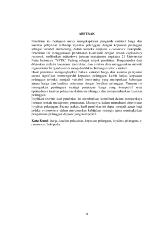 Penelitian ini bertujuan untuk mengeksplorasi pengaruh variabel harga dan kualitas pelayanan terhadap loyalitas pelanggan, dengan kepuasan pelanggan sebagai variabel intervening, dalam konteks platform e-commerce Tokopedia. Penelitian ini menggunakan pendekatan kuantitatif dengan desain explanatory research, melibatkan mahasiswa jurusan manajemen angkatan 21 Universitas Putra Indonesia "YPTK" Padang sebagai subjek penelitian. Pengumpulan data dilakukan melalui kuesioner terstruktur, dan analisis data menggunakan metode regresi linier berganda untuk mengidentifikasi hubungan antar variabel. Hasil penelitian mengungkapkan bahwa variabel harga dan kualitas pelayanan secara signifikan memengaruhi kepuasan pelanggan. Lebih lanjut, kepuasan pelanggan terbukti menjadi variabel intervening yang memperkuat hubungan antara harga dan kualitas pelayanan dengan loyalitas pelanggan. Temuan ini menegaskan pentingnya strategi penetapan harga yang kompetitif serta optimalisasi kualitas pelayanan dalam membangun dan mempertahankan loyalitas pelanggan. Implikasi teoretis dari penelitian ini memberikan kontribusi dalam memperkaya literatur terkait manajemen pemasaran, khususnya dalam memahami determinan loyalitas pelanggan. Secara praktis, hasil penelitian ini dapat menjadi acuan bagi pelaku e-commerce dalam merumuskan kebijakan strategis guna meningkatkan pengalaman pelanggan di pasar yang kompetitif. Kata Kunci: harga, kualitas pelayanan, kepuasan pelanggan, loyalitas pelanggan, ecommerce, Tokopedia