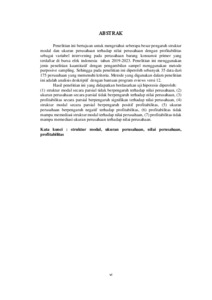 Penelitian ini bertujuan untuk mengetahui seberapa besar pengaruh struktur modal dan ukuran perusahaan terhadap nilai perusahaan dengan profitabilitas sebagai variabel intervening pada perusahaan barang konsumsi primer yang terdaftar di bursa efek indonesia tahun 2019-2023. Penelitian ini menggunakan jenis penelitian kuantitatif dengan pengambilan sampel menggunakan metode purposive sampling. Sehingga pada penelitian ini diperoleh sebanyak 35 data dari 175 perusahaan yang memenuhi kriteria. Metode yang digunakan dalam penelitian ini adalah analisis deskriptif dengan bantuan program eviews versi 12. Hasil penelitian ini yang didapatkan berdasarkan uji hipotesis diperoleh: (1) struktur modal secara parsial tidak berpengaruh terhadap nilai perusahaan, (2) ukuran perusahaan secara parsial tidak berpengaruh terhadap nilai perusahaan, (3) profitabilitas secara parsial berpengaruh signifikan terhadap nilai perusahaan, (4) struktur modal secara parsial berpengaruh positif profitabilitas, (5) ukuran perusahaan berpengaruh negatif terhadap profitabilitas, (6) profitabilitas tidak mampu memediasi struktur modal terhadap nilai perusahaan, (7) profitabilitas tidak mampu memediasi ukuran perusahaan terhadap nilai perusahaan. Kata kunci : struktur modal, ukuran perusahaan, nilai perusahaan, profitabilitas