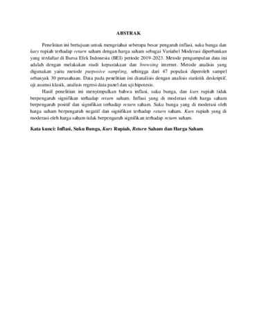 Penelitian ini bertujuan untuk mengetahui seberapa besar pengaruh inflasi, suku bunga dan kurs rupiah terhadap return saham dengan harga saham sebagai Variabel Moderasi diperbankan yang terdaftar di Bursa Efek Indonesia (BEI) periode 2019-2023. Metode pengumpulan data ini adalah dengan melakukan studi kepustakaan dan browsing internet. Metode analisis yang digunakan yaitu metode purposive sampling, sehingga dari 47 populasi diperoleh sampel sebanyak 30 perusahaan. Data pada penelitian ini dianalisis dengan analisis statistik deskriptif, uji asumsi klasik, analisis regresi data panel dan uji hipotesis. Hasil penelitian ini menyimpulkan bahwa inflasi, suku bunga, dan kurs rupiah tidak berpengaruh signifikan terhadap return saham. Inflasi yang di moderasi oleh harga saham berpengaruh positif dan signifikan terhadap return saham. Suku bunga yang di moderasi oleh harga saham berpengaruh negatif dan signifikan terhadap return saham. Kurs rupiah yang di moderasi oleh harga saham tidak berpengaruh signifikan terhadap return saham. Kata kunci: Inflasi, Suku Bunga, Kurs Rupiah, Return Saham dan Harga Saham