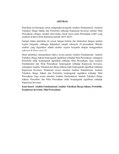 Penelitian ini bertujuan untuk mengetahui pengaruh Analisis Fundamental, Analisisi Teknikal, Harga Saham dan Portofolio terhadap Keputusan Investasi melalui Nilai Perusahaan sebagai variabel intervening (Studi kasus pada Perusahaan LQ45 yang terdaftar di Bursa Efek Indonesia periode 2019-2023). Sampel dalam penelitian ini sesuai dengan kriteria dan ditentukan dengan analisis regresi berganda, sehingga didapatkan sampel sebanyak 10 perusahaan. Metode analisis yang digunakan adalah analisis regresi berganda dengan menggunakan software E-Views versi 12. Hasil penelitian menunjukkan bahwa secara parsial Analisis Fundamental, Analisis Teknikal, Harga Saham berpengaruh signifikan terhadap Nilai Perusahaan, sedangkan Portofolio tidak berpengaruh signifikan terhadap Nilai Perusahaan. Juga Analisis Fundamental dan Nilai Perusahaan berpengaruh terhadap Keputusan Investasi, sedangkan Analisis Teknikal dan Harga Saham tidak berpengaruh signifikan terhadap Keputusan Investasi. Sementara secara simultan Analisis Fundamental, Analisis Teknikal, Harga Saham dan Portofolio berpengaruh signifikan terhadap Nilai Perusahaan. Juga secara simultan Analisis Fundamental, Analisis Teknikal, Harga Saham, Portofolio dan Nilai Perusahaan tidak berpengaruh signifikan terhadap Keputusan Investasi. Kata Kunci: Analisis Fundamnetal, Analisis Teknikal, Harga Saham, Portofolio, Keputusan Investasi, Nilai Perusahaan