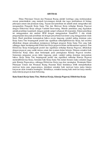 Dinas Pekerjaan Umum dan Penataan Ruang adalah Lembaga yang melaksanakan urusan pemerintahan yang menjadi kewenangan daerah dan tugas pembantuan di bidang pekerjaan umum dan penataan ruang. Tujuan dari penelitian ini adalah untuk mengetahui dan menganalisis Pengaruh Kerja Sama Tim dan Motivasi Kerja terhadap Kinerja Pegawai dengan Efektivitas Kerja sebagai Variabel Intervening. Metode penelitian yang digunakan adalah penelitian kuantitatif, dengan jumlah sampel sebanyak 60 responden. Dalam penelitian ini menggunakan alat analisis SEM dengan menggunakan SmartPLS 3 dan teknik pengumpulan data pada penelitian ini dengan penyebaran kuesioner yang menggunakan skala likert. Hasil penelitian menunjukan bahwa secara langsung variabel paling dominan yaitu Kerja Sama Tim berpengaruh positif dan signifikan terhadapEfektivitas Kerja, hal tersebut dibuktikan dengan perusahaan mempunyai berbagai program Kerja Sama Tim yang baik sehingga dapat mempengaruhi Efektivitas Kerja pegawai dalam melaksanakan tugasnya. Dan Efektivitas Kerja berpengaruh positif dan signifikan terhadap Kinerja Pegawai, dibuktikan dengan pegawai yang sudah merasa aman dan nyaman dalam bekerja. Dimana semakin baik Efektivitas Kerja maka akan berdampak pada peningkatan Kinerja Pegawai tersebut. Sementara pengujian secara tidak langsung untuk variabel paling dominan menyatakan bahwa Kerja Sama Tim berpengaruh positif dan signifikan terhadap Kinerja Pegawai melaluiEfektivitas Kerja. Semakin baik Kerja Sama Tim dalam Instansi maka semakin tinggi pula Kinerja Pegawainya, sehingga Efektivitas Kerja juga ikut meningkat. Pemimpin Dinas Pekerjaan Umum dan Penataan Ruang Pasaman Barat hendaknya lebih memperhatikan motivasi kerja para pegawainnya, demikian semakin baik motivasi kerja maka kinerja karyawan akan semakin meningkat. Sebaliknya, semakin kurang baik motivasi kerja mereka maka kinerja pegawai akan berkurang. Kata Kunci:Kerja Sama Tim, Motivasi Kerja, Kinerja Pegawai, Efektivitas Kerja