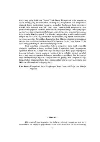 intervening pada Kejaksaan Negeri Tanah Datar. Kompetensi kerja merupakan faktor penting yang mencerminkan keterampilan, pengetahuan, dan pengalaman pegawai dalam menjalankan tugasnya, sedangkan lingkungan kerja mencakup kondisi fisik maupun non-fisik yang dapat memengaruhi kenyamanan dan produktivitas pegawai. Selain itu, motivasi kerja berperan sebagai faktor yang dapat memperkuat atau memperlemah hubungan antara kompetensi kerja dan lingkungan kerja terhadap kinerja pegawai. Penelitian ini menggunakan pendekatan kuantitatif dengan metode survei yang melibatkan 56 responden yang dipilih melalui teknik purposive sampling. Pengolahan dan analisis data dilakukan dengan menggunakan metode Structural Equation Modeling (SEM) berbasis Partial Least Square (PLS) untuk menguji hubungan antara variabel yang diteliti. Hasil penelitian menunjukkan bahwa kompetensi kerja tidak memiliki pengaruh signifikan terhadap motivasi kerja. Lingkungan kerja berpengaruh signifikan Selain itu, kompetensi kerja dan lingkungan kerja juga berpengaruh langsung terhadap kinerja pegawai. Motivasi kerja terbukti menjadi variabel intervening yang memperkuat hubungan antara kompetensi kerja dan lingkungan kerja terhadap kinerja pegawai. Dengan demikian, peningkatan kompetensi kerja dan perbaikan lingkungan kerja dapat meningkatkan kinerja pegawai, terutama jika didukung oleh motivasi kerja yang tinggi. Kata Kunci: Kompetensi Kerja, Lingkungan Kerja, Motivasi Kerja, dan Kinerja Pegawai
