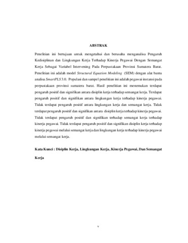 Penelitian ini bertujuan untuk mengetahui dan berusaha menganalisa Pengaruh Kedisiplinan dan Lingkungan Kerja Terhadap Kinerja Pegawai Dengan Semangat Kerja Sebagai Variabel Intervening Pada Perpustakaan Provinsi Sumatera Barat. Penelitian ini adalah model Structural Equation Modeling (SEM) dengan alat bantu analisa SmartPLS 3.0. Populasi dan sampel penelitian ini adalah pegawai instansi pada perpustakaan provinsi sumatera barat. Hasil penelitian ini menemukan terdapat pengaruh positif dan signifikan antara disiplin kerja terhadap semangat kerja. Terdapat pengaruh positif dan signifikan antara lingkungan kerja terhadap kinerja pegawai. Tidak terdapat pengaruh positif antara lingkungan kerja dan semangat kerja. Tidak terdapat pengaruh positif dan signifikan antara disiplin kerja terhadap kinerja pegawai. Tidak terdapat pengaruh positif dan signifikan terhadap semangat kerja terhadap kinerja pegawai. Tidak terdapat pengaruh positif dan signifikan disiplin kerja terhadap kinerja pegawai melalui semangat kerja dan lingkungan kerja terhadap kinerja pegawai melalui semangat kerja. Kata Kunci : Disiplin Kerja, Lingkungan Kerja, Kinerja Pegawai, Dan Semangat Kerja