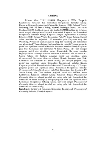Rahima Adiva 21101155310084. Manajemen ( 2025), “Pengaruh Karakteristik Karyawan dan Komunikasi Interpersonal Terhadap Kinerja Karyawan Dengan Organizational Citizenship Behavior (OCB) Sebagai Vriabel Intervening Pada PT Semen Padang” dibawah Bimbingan Bapak Dori Mittra Candana, SE,MM dan Bapak Agam Mei Yudha, SE,MM.Penelitian ini bertujuan untuk menguji seberapa besar Pengaruh Karakteristik Karyawan dan Komunikasi Interpersonal Terhadap Kinerja Karyawan Dengan Organizational Citizenship Behavior (OCB) Sebagai Vriabel Intervening Pada PT Semen Padang. Sampel dalam penelitian ini berjumlah 62 responden pada Karyawan tetap dan Outsorsing. Populasi ini adalah karyawan tetap dan outsorsing unit komunikasi dan sekretarian PT Semen Padang.Hasil penelitian ini yaitu (1) Terdapat pengaruh positif dan signifikan antara Karakteristik Karyawan terhadap Kinerja Karyawan pada Unit. Komunikasi dan Sekretariat PT Semen Padang. (2) Tidak terdapat pengaruh positif dan signifikan antara Karakteristik Karyawan terhadap Organizational Citizenship Behavior pada Unit. Komunikasi dan Sekretariat PT Semen Padang. (3) Terdapat pengaruh positif dan signifikan antara Organizational Citizenship Behavior terhadap Kinerja Karyawan pada Unit. Komunikasi dan Sekretariat PT Semen Padang. (4) Terdapat pengaruh yang positif dan signifikan antara Komunikasi Interpersonal terhadap Kinerja Karyawan pada Unit. Komunikasi dan Sekretariat PT Semen Padang. (5) Terdapat pengaruh positif dan signifikan antara Komunikasi Interpersonal terhadap Organizational Citizenship Behavior pada Unit. Komunikasi dan Sekretariat PT Semen Padang. (6) Tidak terdapat pengaruh positif dan sinifikan antara Krakteristiik Karyawan terhadap Kinerja Karyawan dengan Organizational Citizenship Behavior sebagai Variabel Intervening pada Unit. Komunikasi dan Sekretariat PT Semen Padang.(7) Terdapat pengaruh postif dan signifikan antara Komunikasi Interpersonal terhadap Kinerja Karyawan dengan Organizational Citizenship Behavior sebagai Variabel Intervening pada Unit. Komunikasi dan Sekretariat PT Semen Padang. Kata kunci: Karakteristik Karyawan, Komunikasi Interpersonal, Organizational Citizenship Behavior, Kinerja Karyawan