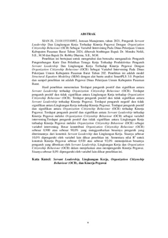 SIAN JS, 21101155310092, Jurusan Manajemen, tahun 2021, Pengaruh Servant Leadership Dan Lingkungan Kerja Terhadap Kinerja Pegawai Dengan Organization Citizenship Behaviour (OCB) Sebagai Variabel Intervening Pada Dinas Pekerjaan Umum Kabupaten Pasaman Barat Tahun 2024, dibawah bimbingan Bapak Dr. Mondra Neldi, S.E., M.M dan Bapak Dr. Robby Dharma, S.E., M.M. Penelitian ini bertujuan untuk mengetahui dan berusaha menganalisis Pengaruh Pengembangan Karir Dan Pelatihan Tenaga Kerja Terhadap Produktivitas Pengaruh Servant Leadership Dan Lingkungan Kerja Terhadap Kinerja Pegawai Dengan Organization Citizenship Behaviour (OCB) Sebagai Variabel Intervening Pada Dinas Pekerjaan Umum Kabupaten Pasaman Barat Tahun 202. Penelitian ini adalah model Structural Equation Modeling (SEM) dengan alat bantu analisi SmartPLS 3.0. Populasi dan sampel penelitian ini adalah Pegawai Dinas Pekerjaan Umum Kabupaten Pasaman Barat. Hasil penelitian menemukan Terdapat pengaruh positif dan signifikan antara Servant Leadership terhadap Organization Citizenship Behaviour (OCB). Terdapat pengaruh positif dan tidak signifikan antara Lingkungan Kerja terhadap Organization Citizenship Behaviour (OCB). Terdapat pengaruh positif dan tidak signifikan antara Servant Leadership terhadap Kinerja Pegawai. Terdapat pengaruh negatif dan tidak signifikan antara Lingkungan Kerja terhadap Kinerja Pegawai. Terdapat pengaruh positif dan signifikan antara Organization Citizenship Behaviour (OCB) terhadap Kinerja Pegawai. Terdapat pengaruh positif dan signifikan antara Servant Leadership terhadap Kinerja Pegawai melalui Organization Citizenship Behaviour (OCB) sebagai variabel intervening.Terdapat pengaruh positif dan tidak signifikan antara Lingkungan Kerja terhadap Kinerja Pegawai melalui Organization Citizenship Behaviour (OCB) sebagai variabel intervening. Besar konstribusi Organization Citizenship Behaviour (OCB) sebesar 0,900 atau sebesar 90,0% yang menggambarkan besarnya pengaruh yang diterimannya dari konstruk Servant Leadership dan Lingkungan Kerja. Sisanya sebesar 10,0% dipengaruhi oleh variabel lain diluar penelitian ini. Sementara nilai R2 untuk konstrak Kinerja Pegawai sebesar 0,920 atau sebesar 92,0% menunjukkan besarnya pengaruh yang diberikan oleh Servant Leadership, Lingkungan Kerja dan Organization Citizenship Behaviour (OCB) dalam menjelaskan atau mempengaruhi Kinerja Pegawai. Sisanya sebesar 8,0% dipengaruhi oleh variabel lain diluar penelitian ini. Kata Kunci: Servant Leadership, Lingkungan Kerja, Organization Citizenship Behaviour (OCB), dan Kinerja Pegawai