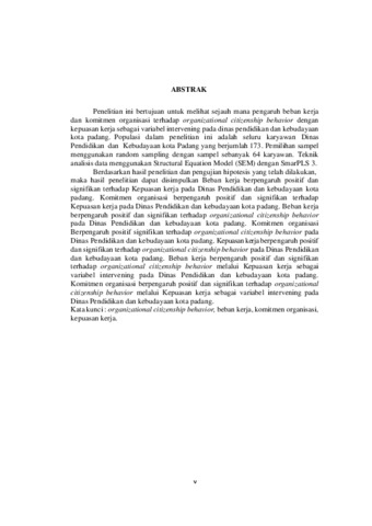 Penelitian ini bertujuan untuk melihat sejauh mana pengaruh beban kerja dan komitmen organisasi terhadap organizational citizenship behavior dengan kepuasan kerja sebagai variabel intervening pada dinas pendidikan dan kebudayaan kota padang. Populasi dalam penelitian ini adalah seluru karyawan Dinas Pendidikan dan Kebudayaan kota Padang yang berjumlah 173. Pemilihan sampel menggunakan random sampling dengan sampel sebanyak 64 karyawan. Teknik analisis data menggunakan Structural Equation Model (SEM) dengan SmarPLS 3. Berdasarkan hasil penelitian dan pengujian hipotesis yang telah dilakukan, maka hasil penelitian dapat disimpulkan Beban kerja berpengaruh positif dan signifikan terhadap Kepuasan kerja pada Dinas Pendidikan dan kebudayaan kota padang. Komitmen organisasi berpengaruh positif dan signifikan terhadap Kepuasan kerja pada Dinas Pendidikan dan kebudayaan kota padang. Beban kerja berpengaruh positif dan signifikan terhadap organizational citizenship behavior pada Dinas Pendidikan dan kebudayaan kota padang. Komitmen organisasi Berpengaruh positif signifikan terhadap organizational citizenship behavior pada Dinas Pendidikan dan kebudayaan kota padang. Kepuasan kerja berpengaruh positif dan signifikan terhadap organizational citizenship behavior pada Dinas Pendidikan dan kebudayaan kota padang. Beban kerja berpengaruh positif dan signifikan terhadap organizational citizenship behavior melalui Kepuasan kerja sebagai variabel intervening pada Dinas Pendidikan dan kebudayaan kota padang. Komitmen organisasi berpengaruh positif dan signifikan terhadap organizational citizenship behavior melalui Kepuasan kerja sebagai variabel intervening pada Dinas Pendidikan dan kebudayaan kota padang. Kata kunci : organizational citizenship behavior, beban kerja, komitmen organisasi, kepuasan kerja.