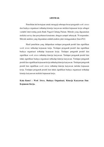 Penelitian ini bertujuan untuk menguji seberapa besar pengaruh work stress dan budaya organisasi terhadap kinerja karyawan melalui kepuasan kerja sebagai variabel intervening pada Bank Nagari Cabang Painan. Metode yang diguanakan melalui survey dan penyebaran konsioner, dengan sampel sebanyak 78 responden. Metode analisis yang digunakan adalah analisis jalur menggunakan SmartPLS. Hasil penelitian yang didapatkan terdapat pengaruh positif dan signifikan work stress terhadap kepuasan kerja. Terdapat pengaruh positif dan signifikan budaya organisasi terhadap kepuasan kerja. Terdapat pengaruh positif dan signifikan work stress terhadap kinerja karyawan. Terdapat pengaruh positif dan tidak signifikan budaya organisasi terhadap kinerja karyawan. Terdapat pengaruh positif dan signifikan kepuasan kerja terhadap kinerja karyawan. Terdapat pengaruh positif dan signifikan work stress terhadap kinerja karyawan melalui kepuasan kerja. Terdapat pengaruh positif dan tidak signifikan budaya organisasi terhadap kinerja karyaawan melalui kepuasan kerja. Kata Kunci : Work Stress, Budaya Organisasi, Kinerja Karyawan Dan Kepuasan Kerja.