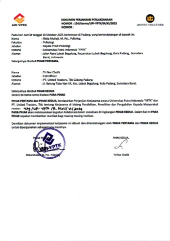 Biro, Kerjasama (2025) Implementation Agreement (IA) Antara Prodi Psikologi UPI-YPTK Dengan PT. United Tractors. Biro Kerjasama UPI YPTK. (Unpublished)