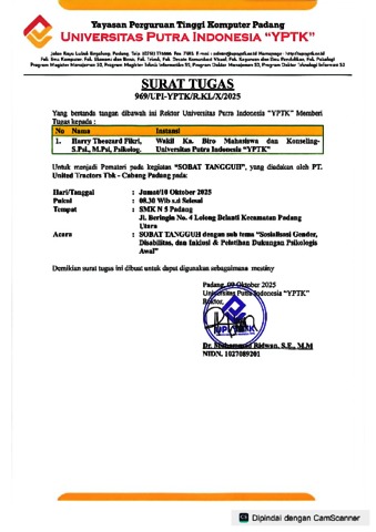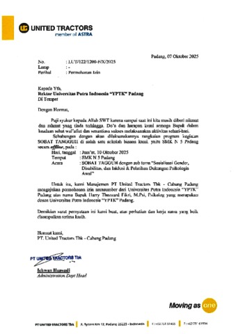 berdasarkan Perjanjian Kerjasama antara Universitas Putra Indonesia "YPTK" dan PT. United Tractors, Tbk tentang Kerjasama di bidang Pendidikan, Penelitian dan Pengabdian Kepada Masyarakat nomor: 429/UPI-YPTK/R.MOU/VI/2024 PARA PIHAK akan melaksanakan kegiatan Kolaborasi dalam sosialisasi di lingkungan PIHAK KEDUA. Dalam hal ini PARA PIHAK sepakat memberikan manfaat bagi masing-masing Institusi.