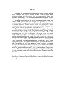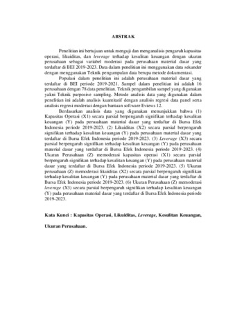 Penelitian ini bertujuan untuk menguji dan menganalisis pengaruh kapasitas operasi, likuiditas, dan leverage terhadap kesulitan keuangan dengan ukuran perusahaan sebagai variabel moderasi pada perusahaan material dasar yang terdaftar di BEI 2019-2023. Data dalam penelitian ini menggunakan data sekunder dengan menggunakan Teknik pengumpulan data berupa metode dokumentasi. Populasi dalam penelitian ini adalah perusahaan material dasar yang terdaftar di BEI periode 2019-2021. Sampel dalam penelitian ini adalah 16 perusahaan dengan 78 data penelitian. Teknik pengambilan sampel yang digunakan yakni Teknik purposive sampling. Metode analisis data yang digunakan dalam penelitian ini adalah analisis kuantitatif dengan analisis regresi data panel serta analisis regresi moderasi dengan bantuan software Eviews 12. Berdasarkan analisis data yang digunakan menunjukkan bahwa (1) Kapasitas Operasi (X1) secara parsial berpengaruh signifikan terhadap kesulitan keuangan (Y) pada perusahaan material dasar yang terdaftar di Bursa Efek Indonesia periode 2019-2023. (2) Likuiditas (X2) secara parsial berpengaruh signifikan terhadap kesulitan keuangan (Y) pada perusahaan material dasar yang terdaftar di Bursa Efek Indonesia periode 2019-2023. (3) Leverage (X3) secara parsial berpengaruh signifikan terhadap kesulitan keuangan (Y) pada perusahaan material dasar yang terdaftar di Bursa Efek Indonesia periode 2019-2023. (4) Ukuran Perusahaan (Z) memoderasi kapasitas operasi (X1) secara parsial berpengaruh signifikan terhadap kesulitan keuangan (Y) pada perusahaan material dasar yang terdaftar di Bursa Efek Indonesia periode 2019-2023. (5) Ukuran perusahaan (Z) memoderasi likuiditas (X2) secara parsial berpengaruh signifikan terhadap kesulitan keuangan (Y) pada perusahaan material dasar yang terdaftar di Bursa Efek Indonesia periode 2019-2023. (6) Ukuran Perusahaan (Z) memoderasi leverage (X3) secara parsial berpengaruh signifikan terhadap kesulitan keuangan (Y) pada perusahaan material dasar yang terdaftar di Bursa Efek Indonesia periode 2019-2023. Kata Kunci : Kapasitas Operasi, Likuiditas, Leverage, Kesulitan Keuangan, Ukuran Perusahaan.