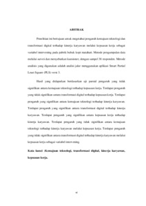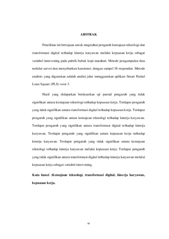 Penelitian ini bertujuan untuk megetahui pengaruh kemajuan teknologi dan transformasi digital terhadap kinerja karyawan melalui kepuasan kerja sebagai variabel intervening pada pabrik bubuk kopi matahari. Metode pengumpulan data melalui survei dan menyebarkan kuesioner, dengan sampel 38 responden. Metode analisis yang digunakan adalah analisi jalur menggunakan aplikasi Smart Partial Least Square (PLS) versi 3. Hasil yang didapatkan berdasarkan uji parsial pengaruh yang tidak signifikan antara kemajuan teknologi terhadap kepuasan kerja. Terdapat pengaruh yang tidak signifikan antara transformasi digital terhadap kepuasan kerja. Terdapat pengaruh yang signifikan antara kemajuan teknologi terhadap kinerja karyawan. Terdapat pengaruh yang signifikan antara transformasi digital terhadap kinerja karyawan. Terdapat pengaruh yang signifikan antara kepuasan kerja terhadap kinerja karyawan. Terdapat pengaruh yang tidak signifikan antara kemajuan teknologi terhadap kinerja karyawan melalui kepuasan kerja. Terdapat pengaruh yang tidak signifikan antara transformasi digital terhadap kinerja karyawan melalui kepuasan kerja sebagai variabel intervening. Kata kunci :Kemajuan teknologi, transformasi digital, kinerja karyawan, kepuasan kerja.