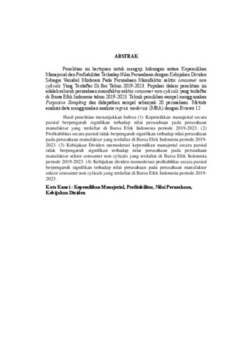 Penelitian ini bertujuan untuk menguji hubungan antara Kepemilikan Manajerial dan Profiabilitas Terhadap Nilai Perusahaan dengan Kebijakan Dividen Sebagai Variabel Moderasi Pada Perusahaan Manufaktur sektor consumer non cylicals Yang Terdaftar Di Bei Tahun 2019-2023. Populasi dalam penelitian ini adalah seluruh perusahaan manufaktur sektor consumer non-cylicals yang terdaftar di Bursa Efek Indonesia tahun 2019-2023. Teknik pemilihan sampel menggunakan Purposive Sampling dan didapatkan sampel sebanyak 20 perusahaan. Metode analisis data menggunakan analisis regresi moderasi (MRA) dengan Eviews 12 Hasil penelitian menunjukkan bahwa (1) Kepemilikan manajerial secara parsial berpengaruh signifikan terhadap nilai perusahaan pada perusahaan manufaktur yang terdaftar di Bursa Efek Indonesia periode 2019-2023. (2) Profitabilitas secara parsial tidak berpengaruh signifikan terhadap nilai perusahaan pada perusahaan manufaktur yang terdaftar di Bursa Efek Indonesia periode 2019- 2023. (3) Kebijakan Dividen memoderasi kepemilkan manajerial secara parsial tidak berpengaruh signifikan terhadap nilai perusahaan pada perusahaan manufaktur sektor consumer non cylicals yang terdaftar di Bursa Efek Indonesia periode 2019-2023. (4) Kebijakan dividen memoderasi profitabilitas secara parsial berpengaruh signifikan terhadap nilai perusahaan pada perusahaan manufaktur sektor consumer non cylicals yang terdaftar di Bursa Efek Indonesia periode 2019- 2023. Kata Kunci : Kepemilikan Manajerial, Profitabilitas, Nilai Perusahaan, Kebijakan Dividen