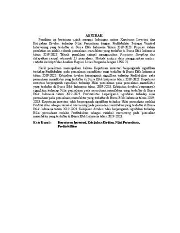 Penelitan ini bertujuan untuk menguji hubungan antara Keputusan Investasi dan Kebijakan Dividen terhadap Nilai Perusahaan dengan Profitabilitas Sebagai Variabel Intervening yang terdaftar di Bursa Efek Indonesia Tahun 2019-2023. Populasi dalam penelitian ini adalah seluruh perusahaan manufaktur yang terdaftar di Bursa Efek Indonesia tahun 2019-2023. Teknik pemilihan sampel menggunakan Purposive Sampling dan didapatkan sampel sebanyak 35 perusahaan. Metode analisis data menggunakan analisis statistik deskriptif dan Analisis Regresi Linier Berganda dengan SPSS 21. Hasil penellitian menunjukkan bahwa Keputusan investasi berpengaruh signifikan terhadap Profitabilitas pada perusahaan manufaktur yang terdaftar di Bursa Efek Indonesia tahun 2019-2023. Kebijakan dividen berpengaruh signifikan terhadap Profitabilitas pada perusahaan manufaktur yang terdaftar di Bursa Efek Indonesia tahun 2019-2023. Keputusan investasi berpengaruh signifikan terhadap Nilai perusahaan pada perusahaan manufaktur yang terdaftar di Bursa Efek Indonesia tahun 2019-2023. Kebijakan dividen berpengaruh signifikan terhadap Nilai perusahaan pada perusahaan manufaktur yang terdaftar di Bursa Efek Indonesia tahun 2019-2023. Profitabilitas berpengaruh signifikan terhadap nilai perusahaan pada perusahaan manufaktur yang terdaftar di Bursa Efek Indonesia tahun 2019-2023. Keputusan investasi tidak berpengaruh signifikan terhadap Nilai perusahaan melalui Profitabilitas sebagai variabel intervening pada perusahan manufaktur yang terdaftar di Bursa Efek Indonesia tahun 2019-2023. Kebijakan dividen tidak berpengaruh signifikan terhadap Nilai perusahaan melalui Profitabilitas sebagai variabel intervening pada perusahan manufaktur yang terdaftar di Bursa Efek Indonesia tahun 2019-2023. Kata Kunci : Keputusan Investasi, Kebijakan Dividen, Nilai Perusahaan, Profitabillitas