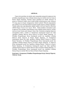 Tujuan dari penelitian ini adalah untuk mengetahui pengaruh kompensasi dan pelatihan pengembangan kerja terhadap kinerja pegawai melalui motivasi kerja di Kantor Bupati Sijunjung. Populasi dalam penelitian ini adalah sebanyak 78 pegawai. Sementara sampel yang di ambil adalah seluruh pegawai yaitu sebanyak 78 orang pegawai dengan menggunakan teknik kualitatif. Metode pengumpulan data melalui survei dan penyebaran kuesioner kepada pegawai sebagai responden. Teknik analisa data yang digunakan adalah Analisis structural Equation Modeling (SEM) Dengan Partial Least Square (PLS) . Hasil penelitian menunjukan pada kompensasi dan pelatihan pengembangan kerja terhadap kinerja pegawai melalui motivasi kerja berada pada kategori cukup baik. Kemudian pengujian hipotesis menunjukkan bahwa variabel (1) Kompensasi berpengaruh negatif dan tidak signifikan terhadap Motivasi Kerja Pegawai di Kantor Bupati Sijunjung. (2) Pelatihan Pengembangan Kerja berpengaruh positif dan signifikan terhadap Motivasi Kerja Pegawai di Kantor Bupati Sijunjung. (3) Kompensasi berpengaruh negatif dan tidak signifikan terhadap Kinerja Pegawai di Kantor Bupati Sijunjung. (4) Pelatihan Pengembangan Kerja berpengaruh positif dan signifikan terhadap Kinerja Pegawai di Kantor Bupati Sijunjung. (5) Motivasi Kerja berpengaruh positif dan signifikan terhadap Kinerja Pegawai di Kantor Bupati Sijunjung. (6) Kompensasi berpengaruh negatif dan tidak signifikan terhadap Kinerja Pegawai melalui Motivasi Kerja di Kantor Bupati Sijunjung. (7) Pelatihan Pengembangan Kerja berpengaruh positif dan signifikan terhadap Kinerja Pegawai melalui Motivasi Kerja di Kantor Bupati Sijunjung. Kata kunci : Kompensasi, Pelatihan Pengembangan Kerja, Kinerja Pegawai, Motivasi Kerja