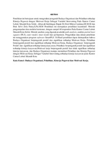 Penelitian ini bertujuan untuk mengetahui pengaruh Budaya Organisasi dan Pelatihan terhadap Kinerja Pegawai dengan Motivasi Kerja Sebagai Variabel Intervening Pada Kantor Camat Lubuk Sikarah Kota Solok , dibawah bimbingan Bapak Dr.Dori Mittra Candana,SE.M.M dan Ibuk Selvi Zola Fenia,S,Psi.M.M Penelitian ini merupakan penelitian kuantitatif. Metode pengumpulan data melalui kuisioner, dengan sampel 60 responden Pada Kantor Camat Lubuk Sikarah Kota Solok. Metode analisis yang digunakan adalah path analysis, analisis partial least squares (PLS), outer model, inner model dan uji hipotesis. Pengolahan data dalam penelitian ini menggunakan program software SmartPLS 3.0.Hasil penelitian dapat disimpulkan bahwa Budaya Organisasi berpengaruh positif dan signifikan terhadap Motivasi Kerja, Pelatihan berpengaruh positif dan signifikan terhadap Motivasi Kerja, Budaya Organisasi berpengaruh Positif dan signifikan terhadap kinerja karyawan, Pelatihan berpengaruh positif dan signifikan terhadap kinerja karyawan,Motivasi kerja berpengaruh positif dan tidak signifikan terhadap kinerja karyawan, dan Budaya Organisasi mampu memediasi Pelatihan dan Kinerja Pegawai dengan Motivasi Kerja Sebagai Variabel Intervening,terhadap kinerja karyawan pada Kantor Camat Lubuk Sikarah Kota Kata Kunci: Budaya Organisasi, Pelatihan, Kinerja Pegawai dan Motivasi Kerja.