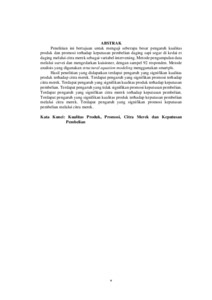 Penelitian ini bertujuan untuk menguji seberapa besar pengaruh kualitas produk dan promosi terhadap keputusan pembelian daging sapi segar di kedai et daging melalui citra merek sebagai variabel intervening. Metode pengumpulan data melalui survei dan mengedarkan kuisioner, dengan sampel 92 responden. Metode analisis yang digunakan structural equation modeling menggunakan smartpls. Hasil penelitian yang didapatkan terdapat pengaruh yang signifikan kualitas produk terhadap citra merek. Terdapat pengaruh yang signifikan promosi terhadap citra merek. Terdapat pengaruh yang signifikan kualitas produk terhadap keputusan pembelian. Terdapat pengaruh yang tidak signifikan promosi keputusan pembelian. Terdapat pengaruh yang signifikan citra merek terhadap keputusan pembelian. Terdapat pengaruh yang signifikan kualitas produk terhadap keputusan pembelian melalui citra merek. Terdapat pengaruh yang signifikan promosi keputusan pembelian melalui citra merek. Kata Kunci: Kualitas Produk, Promosi, Citra Merek dan Keputusan Pembelian