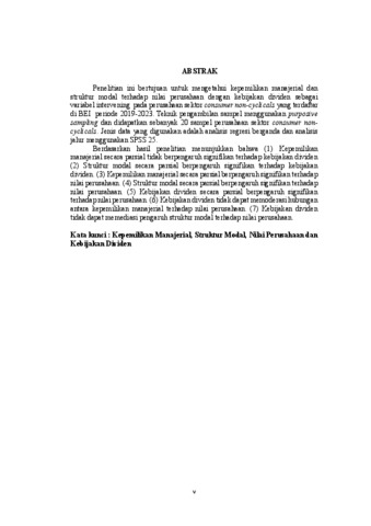 Penelitian ini bertujuan untuk mengetahui kepemilikan manajerial dan struktur modal terhadap nilai perusahaan dengan kebijakan dividen sebagai variabel intervening pada perusahaan sektor consumer non-cyclicals yang terdaftar di BEI periode 2019-2023. Teknik pengambilan sampel menggunakan purposive sampling dan didapatkan sebanyak 20 sampel perusahaan sektor consumer noncyclicals. Jenis data yang digunakan adalah analisis regresi berganda dan analisis jalur menggunakan SPSS 25. Berdasarkan hasil penelitian menunjukkan bahwa (1) Kepemilikan manajerial secara parsial tidak berpengaruh signifikan terhadap kebijakan dividen (2) Struktur modal secara parsial berpengaruh signifikan terhadap kebijakan dividen. (3) Kepemilikan manajerial secara parsial berpengaruh signifikan terhadap nilai perusahaan. (4) Struktur modal secara parsial berpengaruh signifikan terhadap nilai perusahaan. (5) Kebijakan dividen secara parsial berpengaruh signifikan terhadap nilai perusahaan. (6) Kebijakan dividen tidak dapat memoderasi hubungan antara kepemilikan manajerial terhadap nilai perusahaan. (7) Kebijakan dividen tidak dapat memediasi pengaruh struktur modal terhadap nilai perusahaan. Kata kunci : Kepemilikan Manajerial, Struktur Modal, Nilai Perusahaan dan Kebijakan Dividen