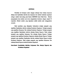 Penelitian ini bertujuan untuk menguji seberapa besar kinerja karyawan ditinjau dari kepribadian individu dan kerjasama tim melalui komitmen organisasi sebagai variabel intervening pada Kantor BKPSDM Lima Puluh Kota . Metode pengumpulan data melalui survei dan mengedarkan kuisioner, dengan sampel 55 responden. Metode analisis yang digunakan adalah analisis jalur menggunakan smartpls. Hasil penelitian yang didapatkan berdasarkan terdapat pengaruh yang signifikan Kepribadian individu terhadap Komitmen Organisasi. Terdapat pengaruh yang signifikan Kerjasama Tim terhadap Komitmen Organisasi. Terdapat pengaruh yang signifikan Kepribadian individu terhadap Kinerja Pegawai. Tidak terdapat pengaruh yang signifikan Kerjasama Tim terhadap Kinerja Pegawai. Terdapat pengaruh yang signifikan Komitmen Organisasi terhadap Kinerja Pegawai. Terdapat pengaruh yang signifikan Kepribadian individu terhadap Kinerja Pegawai melalui Komitmen Organisasi. Tidak terdapat pengaruh yang signifikan Kerjasama Tim terhadap Kinerja Pegawai melalui Komitmen Organisasi. Kata Kunci: Kepribadian Individu, Kerjasama Tim, Kinerja Pegawai, dan Komitmen Organisasi