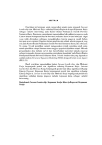Penelitian ini bertujuan untuk mengetahui sejauh mana pengaruh Servant Leadership dan Motivasi Kerja terhadap Kinerja Pegawai dengan Kepuasan Kerja sebagai variabel intervening pada Kantor Badan Pendapatan Daerah Provinsi Sumatera Barat. Fenomena yang diamati menunjukkan bahwa kinerja pegawai pada Kantor Badan Pendapatan Daerah Provinsi Sumatera Barat belum mencapai target yang telah ditentukan sehingga mengakibatkan kinerja pegawai masih belum tercapai secara optimal. Populasi dalam penelitian ini adalah seluruh pegawai yang ada pada Kantor Badan Pendapatan Daerah Provinsi Sumatera Barat yaitu sebanyak 56 orang. Teknik pemilihan sampel menggunakan teknik sampling jenuh yaitu teknik pemilihan sampel dimana semua anggota populasi dijadikan sampel. Metode pengumpulan data melalui survei dan menyebarkan kuesioner kepada pegawai sebagai responden dengan menggunakan pendekatan kuantitatif pada Kantor Badan Pendapatan Daerah Provinsi Sumatera Barat. Teknik Analisa data yang digunakan adalah analisis Structural Equation Modeling (SEM) dengan Partial Least Square (PLS) 3.0. Hasil penelitian menunjukkan bahwa Servant leardership, dan Motivasi Kerja berpengaruh positif dan signifikan terhadap Kepuasan Kerja. Servant leardership dan Motivasi Kerja berpengaruh positif dan tidak signifikan terhadap Kinerja Pegawai. Kepuasan Kerja berpengaruh positif dan signifikan terhadap Kinerja Pegawai. Servant leardership dan Motivasi Kerja berpengaruh positif dan signifikan terhadap kinerja pegawai melalui kepuasan kerja sebagai variabel intervening. Kata kunci: Servant Leadership, Kepuasan Kerja, Kinerja Pegawai, Kepuasan Kerja