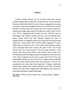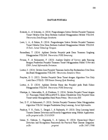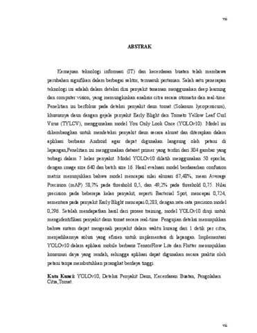 Kemajuan teknologi informasi (IT) dan kecerdasan buatan telah membawa perubahan signifikan dalam berbagai sektor, termasuk pertanian. Salah satu penerapan teknologi ini adalah dalam deteksi dini penyakit tanaman menggunakan deep learning dan computer vision, yang memungkinkan analisis citra secara otomatis dan real-time. Penelitian ini berfokus pada deteksi penyakit daun tomat (Solanum lycopersicum), khususnya daun dengan gejala penyakit Early Blight dan Tomato Yellow Leaf Curl Virus (TYLCV), menggunakan model You Only Look Once (YOLOv10). Model ini dikembangkan untuk mendeteksi penyakit daun secara akurat dan diterapkan dalam aplikasi berbasis Android agar dapat digunakan langsung oleh petani di lapangan,Penelitian ini menggunakan dataset primer yang terdiri dari 304 gambar yang terbagi dalam 7 kelas penyakit. Model YOLOv10 dilatih menggunakan 50 epochs, dengan image size 640 dan batch size 16. Hasil evaluasi model berdasarkan confusion matrix menunjukkan bahwa model mencapai nilai akurasi 67,48%, mean Average Precision (mAP) 58,7% pada threshold 0,5, dan 49,2% pada threshold 0,75. Nilai precision pada beberapa kelas penyakit, seperti Bacterial Spot, mencapai 0,724, sementara pada penyakit Early Blight mencapai 0,283, dengan rata-rata precision model 0,296. Setelah mendapatkan hasil dari proses training, model YOLOv10 diuji untuk mengidentifikasi penyakit daun tomat secara real-time. Pengujian deteksi menunjukkan bahwa sistem dapat mengenali penyakit dalam waktu kurang dari 1 detik per citra, menjadikannya solusi yang efisien untuk implementasi di lapangan. Implementasi YOLOv10 dalam aplikasi mobile berbasis TensorFlow Lite dan Flutter menunjukkan konsumsi daya yang rendah, sehingga aplikasi dapat digunakan secara praktis oleh petani tanpa membutuhkan perangkat berdaya tinggi.
